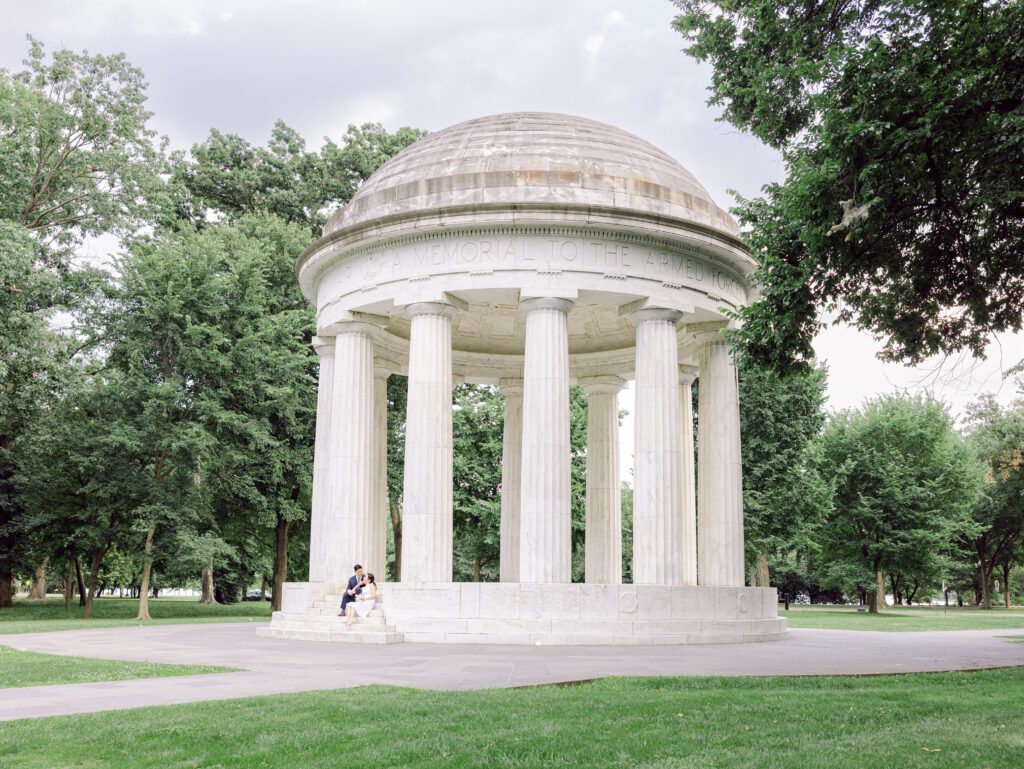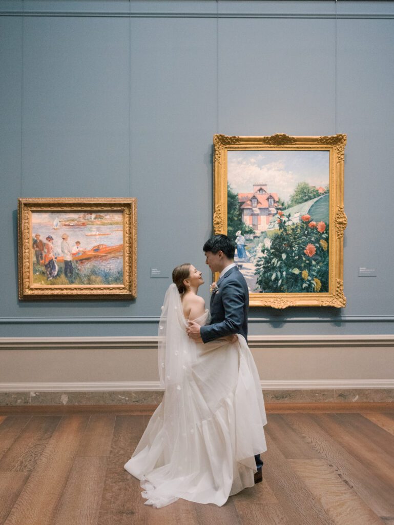 For couples drawn to art and architecture, the National Gallery of Art is one of the most sophisticated backdrops in the city. Ceremonies cannot take place inside the museum, so many couples choose to exchange vows on the nearby National Mall (perhaps at the aforementioned DC War Memorial) before visiting the gallery for portraits. Inside, the atmosphere is timeless and grand. The West Building is my personal favorite, especially the Rotunda, which is inspired by the Pantheon in Rome, where Italian green marble columns create an unforgettable setting for photographs. Another hidden gem is the Garden Courts, where light-filled courtyards with greenery, stone benches, and a quiet elegance are perfect for private moments together before heading to a nearby restaurant for an intimate dinner.